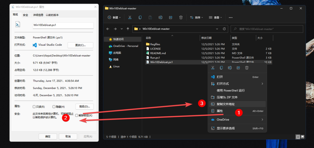 通过 Code > Download Zip 下载 GitHub 上的 Win10Debloat 项目(链接:https://github.com/Raphire/Win10Debloat),解压至任意文件夹。右键其中的 Win10Debloat.ps1,选择 属性,并在弹出的面板中选择 解除锁定 以保证脚本能够正确运行。再右键复制其文件地址,我们会得到类似 D:\Downloads\Win10Debloat-master\Win10Debloat.ps1 的路径。