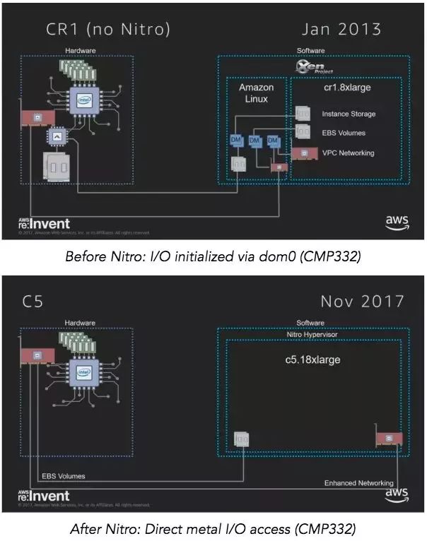 引入Nitro是AWS EC2极具突破性的创新。上图回顾总结了EC2虚拟化技术的变迁史,历代更新中,从纯软的虚拟化到半虚拟化,硬件直接参与度越高,性能越好。最开始,连CPU和内存都是虚拟的,后来,通过ASIC硬件运行基于KVM的Hypervisior取代了原来的Xen虚拟化方案,CPU、内存、网络、存储都演变成硬件支撑,真正意义上实现硬件虚拟化,性能大幅提升。