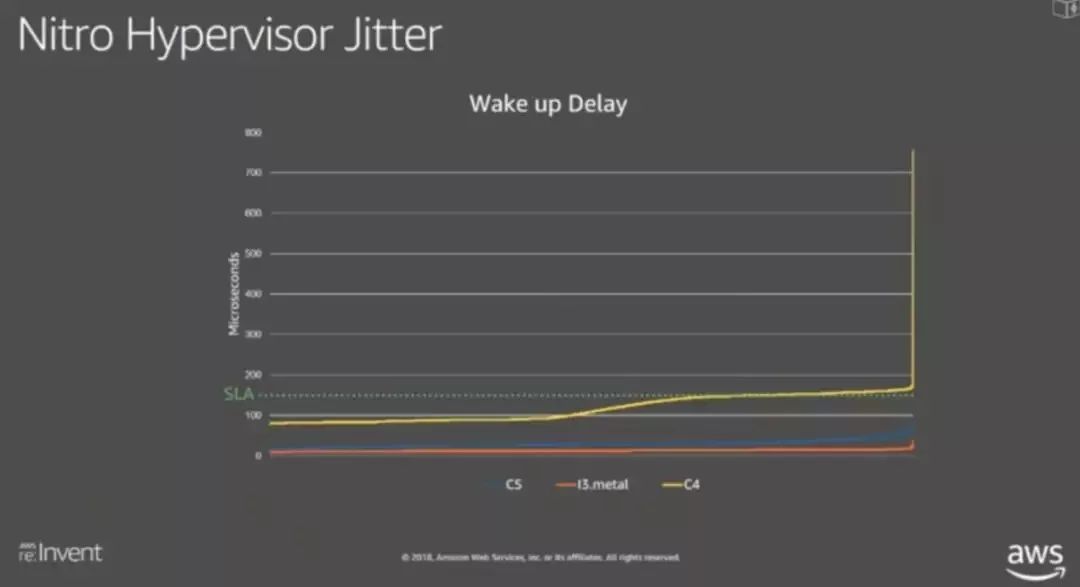 把原来虚拟机承载的作业交给专有硬件后,带来了很多变化,最主要的就是性能上的提升。AWS首席技术布道师Jeff Bar在一篇博客里写道:部署Nitro Hypervisor的实例跟裸机服务器主机相比,性能只相差大约1%,基本可以忽略。上图来自2018年AWS re:Invent大会keynote:采用Nitro Hypervisor的C5实例与没采用Nitro的早期实例、裸机服务器主机的唤醒时延对比,C5主机表现与裸机服务器主机差别非常小。
