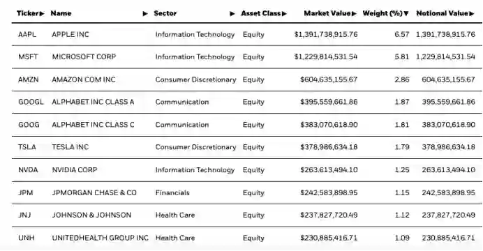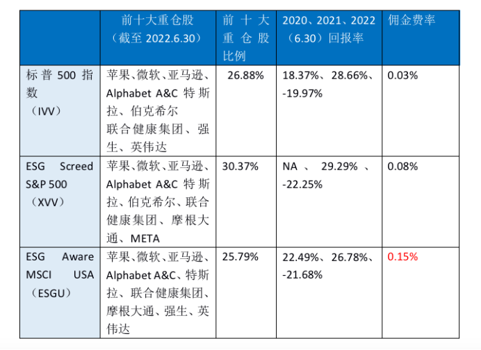 不以ESG指标为导向的核心标普500指数Core S&P500 (IVV)、ESG筛选的标普500指数(XVV)、ESG Aware MSCI USA (ESGU),这三只基金中持股最多的均是苹果、微软、亚马逊、Alphabet A&C和特斯拉;最大的行业敞口均是科技、医疗保健、金融服务和消费品。