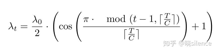 这篇文章是2017年在ICLR上的一篇文章,作者是densenet的一作,这篇CVPR的文章中也就采用了这种训练一次得到多个模型的思路,进行了对上述的 Boot 方法需要多个初始化得到多个模型的弊端进行了改进,利用的是余弦退火法,通过周期性地改变学习速率以得到多个不同的模型,使用的学习速率的公式为: