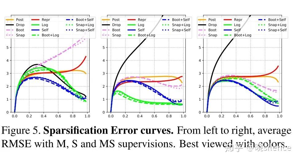 其余的部分可以看文章,里面有更多的实验数据以及Supplementary Material里面的一些说明会更为详细,个人觉得这篇文章虽然用的方法基本都是别人提出来的,不过实验确实十分充分,对11中方法(其中有组合的)进行了实验,并且提出的评价指标后续可能可以用得上,现在自监督的不确定度估计很大程度上都是做出来这个估计,但是没有实际的用处,而且到底不确定度是不是可靠的,还是说只是一个噱头,其实是不明确的,至少这个文章开了一个头,后面应该可以用很多基于这个的工作放出来。