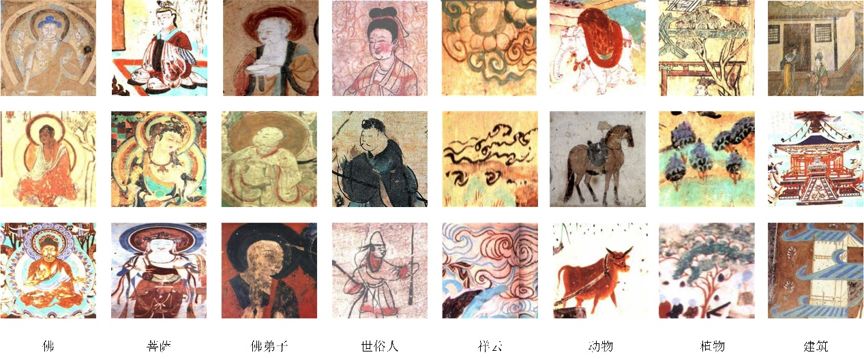 在古丝绸之路的敦煌,一座莫高窟,即拥有4.5万余平方米古代壁画,这些古代壁画是人类最为瑰丽的珍宝,也是列入《世界文化遗产名录》的文化遗产。壁画的艺术元素鉴别、创作时代鉴定、绘画风格规律分析、壁画修复等构成文化遗产研究与保护的重要工作。其中,对壁画中的艺术元素实例进行自动分类与识别是后续高层模式识别与艺术内容鉴定的关键技术。