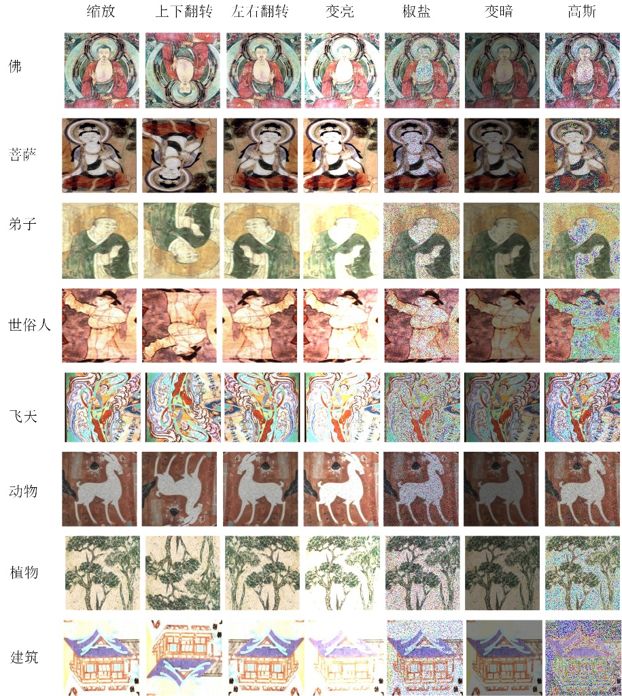 通过对收集的古代壁画艺术图像进行研究,将数据集的类别设定为佛像、菩萨、祥云、世俗人物、佛弟子、动物、植物和建筑等八类艺术形象。论文对采集到的数据使用缩放、亮度变换、加噪和翻转等数据集增强算法来进行扩展。