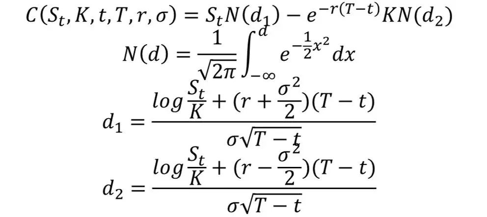这里,St 代表的资产在t 时刻的价格水平。σ 代表标的资产常数的波动率(即标准差),K 代表期权的执行价格,T 代表期权的到期期限,r 代表常数的无风险短期利率。