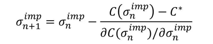 这个方程并没有显式解,这样需要使用列如Newton等数值方法来估计正确的解。最常用的是Newton方法,使用相关函数的一阶导数,直到达到了规定的迭代次数或者是某种精确性。对于某个初始值 σ^imp 和 0<n<∞: