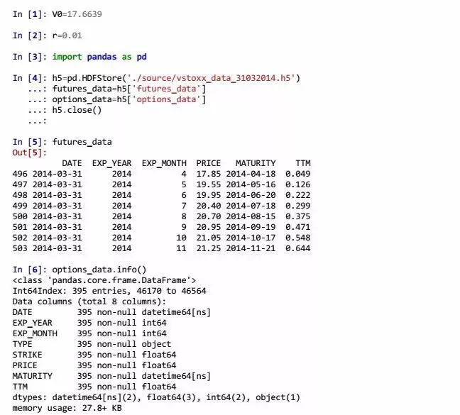 其他参数都来自于期权数据以及需要进行计算获得。数据存储在pandas DataFrame对象中并保存在PyTables数据库文件中。我们需要将它读入内存。