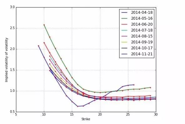 接着我们对所有的日期进行迭代并作图。在这里可以看到一个明显的波动率微笑图形。而且对于长期的期权来说更为明显。