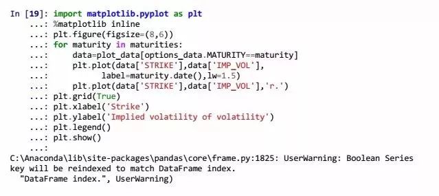 为了数据的可视化,我们对于数据集的所有到期日进行迭代,并且将隐含波动率做成线状图或者单点图。因为所有的到期日显示为多个时间,我们需要使用一点技巧来获得没有重复的,排序的日期列表。在Python中,set操作可以去掉重复项目,但是获得的是没有排序的期限集合。因此,我们还要对set进行排序。