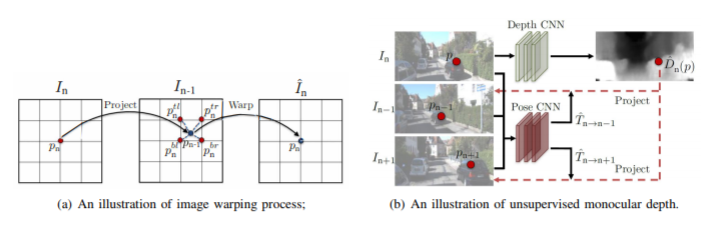 无监督方法的基本模型:无监督方法由单眼图像序列训练,几何约束建立在相邻帧之间的投影上