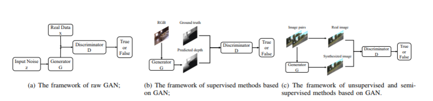 基于对抗性学习的方法:由于提出的对抗性学习在数据生成方面的突出表现,近年来成为一个研究热点。各种算法、理论和应用已得到广泛发展。对抗式学习深度估计的框架如图所示。