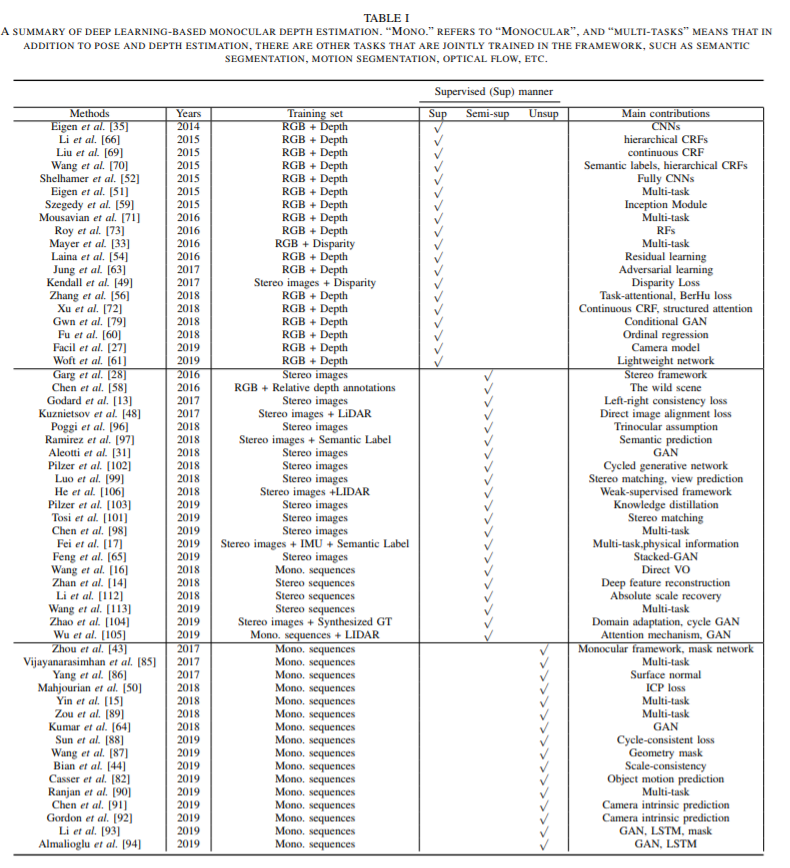 基于深度学习的方法:随着深度学习的快速发展,深度神经网络在图像处理方面表现出了突出的性能,如目标检测和语义分割等领域,最近的发展表明,基于深度学习,可以从单个图像中以端到端的方式恢复像素级深度图。各种神经网络已经证明了它们对解决单目深度估计的有效性,例如卷积神经网络(CNNs),递归神经网络(RNNs),变分自动编码器(VAEs)和生成对抗网络(GANs)。本综述的主要目的是提供对主流算法的直观理解,这些算法对单目深度估计做出了重大贡献,我们从学习方法的角度回顾了单目深度估计的一些相关工作。