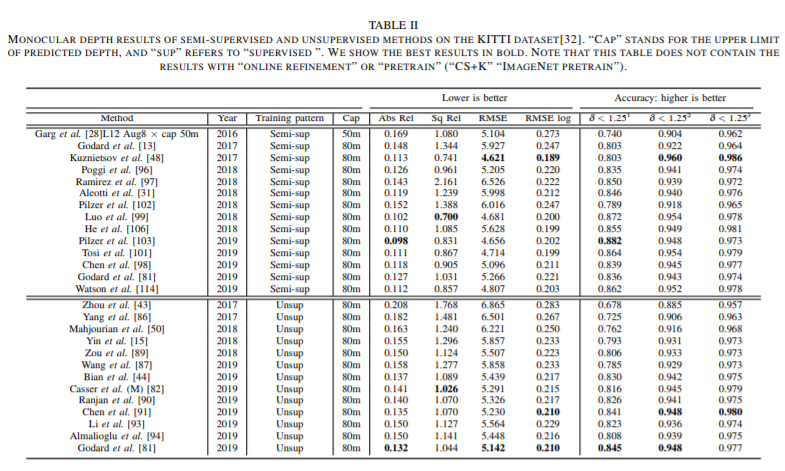 在本节中,我们将从使用地面真实性的角度来回顾单目深度估计方法:有监督方法、无监督方法和半监督方法。虽然无监督和半监督方法的训练过程依赖于单目视频或立体图像对,但训练后的深度网络在测试过程中从单个图像预测深度图。我们从训练数据、监督信号和贡献等方面对现有的方法进行了总结,并收集了在KITTI数据集上评价的无监督和半监督算法的定量结果。