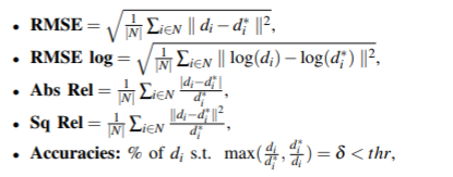 为了评价和比较各种深度估计网络的性能,文章提出了一种常用的深度估计网络性能评价方法,该方法有五个评价指标:RMSE、RMSE-log、Abs-Rel、Sq-Rel、精度。这些指标的公式如下: