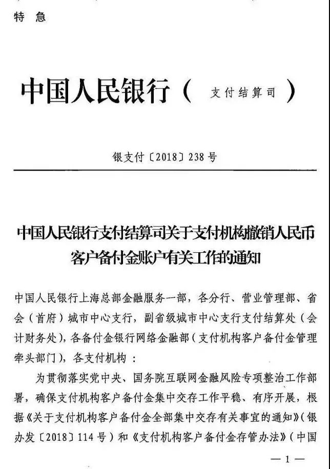 央行支付结算司近日下发《中国人民银行支付结算司关于支付机构撤销人民币客户备付金账户有关工作的通知》的特急文件,其中指出,支付机构能够依托银联和网联清算平台实现收、付款等相关业务的,应于2019年1月14日前撤销开立在备付金银行的人民币客户备付金账户。