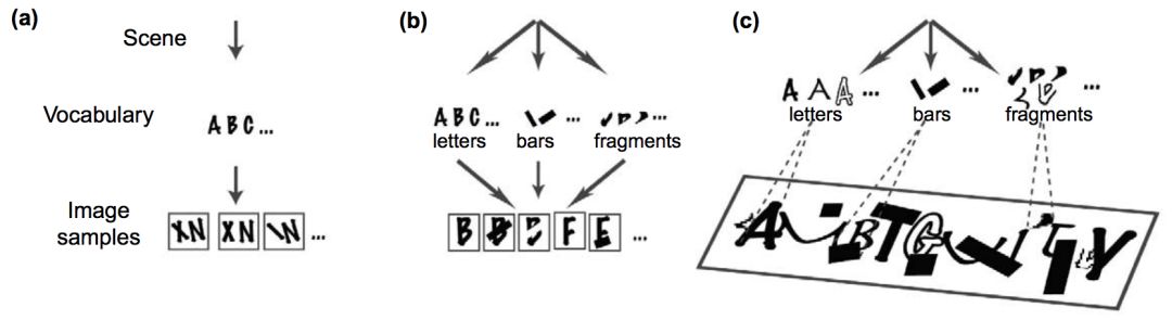 图 4:从(a)到(c),可变性递增并使用了遮挡。(c)是一个庞大的组合数据集示例,本质上和验证码相同。有趣的是,关于验证码的研究表明,组合性模型的性能很好,但深度神经网络的表现却很差。