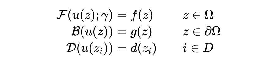 相比传统微分方程数值求解的描述,这里多出了第三行式子,也就是对于数据的使用,这也是 PINN 的特点之一。当然,这三个条件也不一定全都出现,比如边界条件消失,从传统数值方法的角度来看甚至不能满足定解条件。