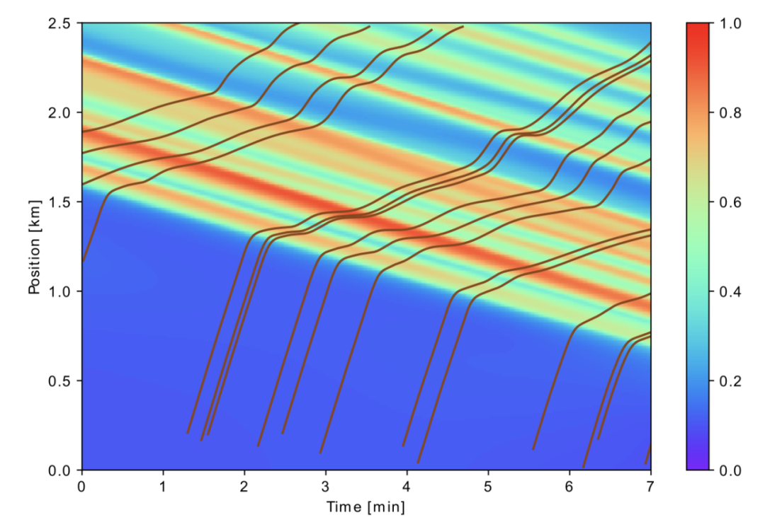 推断的图像显式了红色的高密度堵车处在后移,其上的曲线就是所谓的探测车辆轨迹,在密度高的地方会减速。