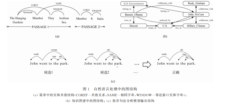 自然语言处理中存在很多图结构。如图 1 所 示,从句法结构、语义关系图、篇章关系结构,到实体和共指结构、关系结构和知识图谱,都是一般的图结 构。一个句子内部的字、词相邻关系也构成图结构。形式上,图由节点和边组成。本文以三类图结构为 例,观察自然语言处理任务中相关的节点和边,以便 更具体地了解这些任务所对应的图。