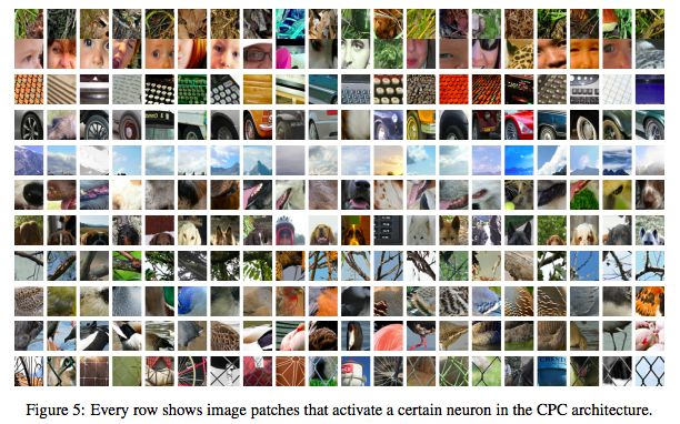 图5:每一行都显示了激活CPC架构的某个神经元的image patches