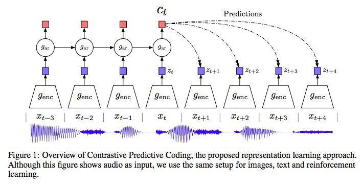 图1:对比预测编码的概览,即我们提出的表示学习方法。虽然图中将音频作为输入,但是我们对图像、文本和强化学习使用的是相同的设置。