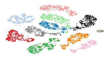 图2:10个说话者子集的音频表示的t-SNE可视化。每种颜色代表不同的说话者。