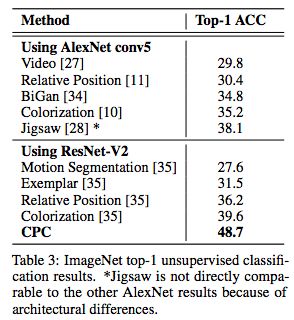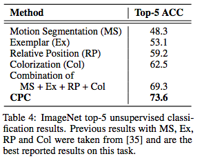 表3和表4显示了与state-of-the-art相比,CPC模型在ImageNet top-1和top-5的分类精度。尽管相对领域不可知,但CPC模型在top-1相比当前最优模型的精度提高了9%,在top-5的精度提高了4%。