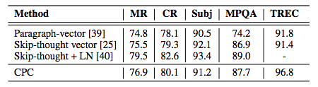 在自然语言实验中,我们首先在BookCorpus 数据集上学习我们的无监督模型,并通过对一组分类任务使用CPC表示来评估模型作为通用特征提取器的能力。