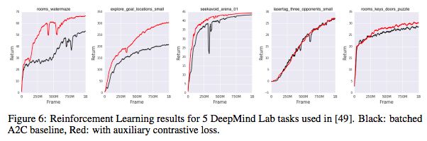 图6:五个DeepMind Lab任务的强化学习结果。黑色:batched A2C基线,红色:添加辅助对比损失