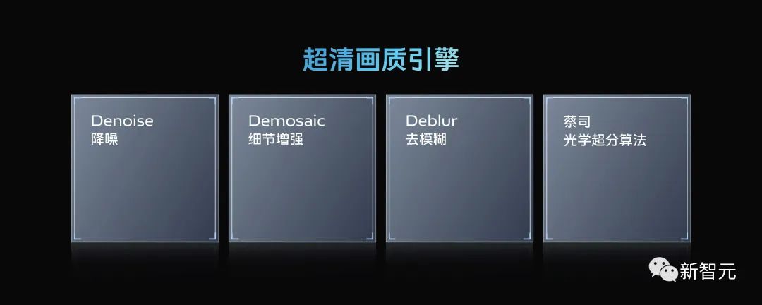 超清画质引擎从底层改写了ISP图像处理链路,将图像处理AI化,包含了Denoise降噪、Demosaic细节恢复、Deblur去模糊三大重要模块,以及蔡司光学超分算法。