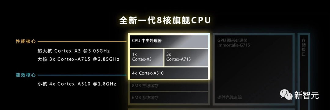 CPU:1个最高主频达到3.05GHz的X3超大核,3个2.85GHz的A715,4个1.8GHz的A510,外加8MB三级缓存和6MB系统缓存,功耗比天玑9000降低25%。