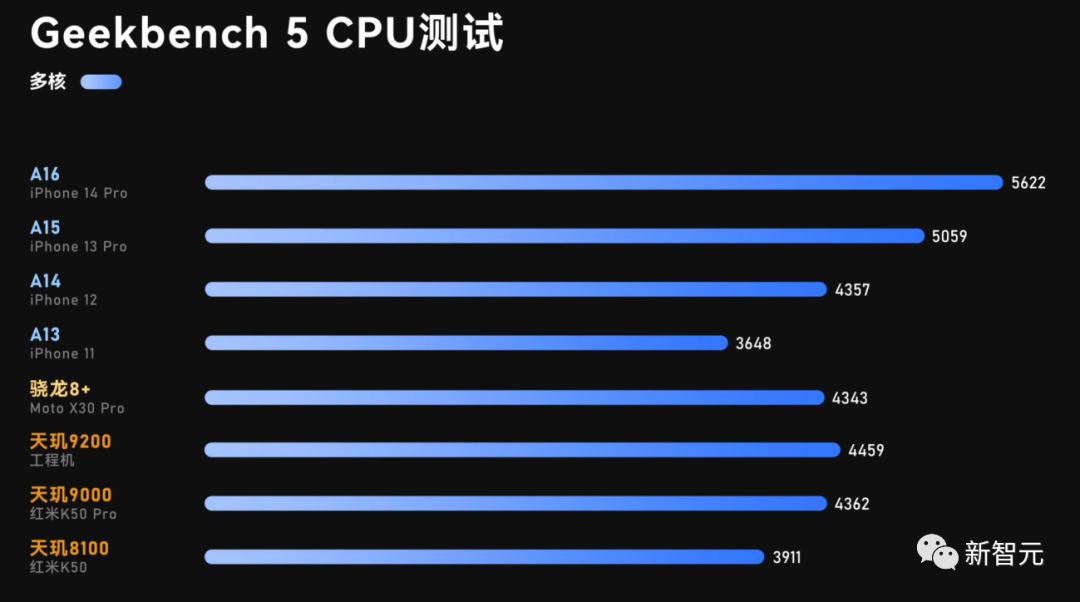 从CPU多核性能看,整体略强于苹果A14水平,距离A15和A16还有一定距离。