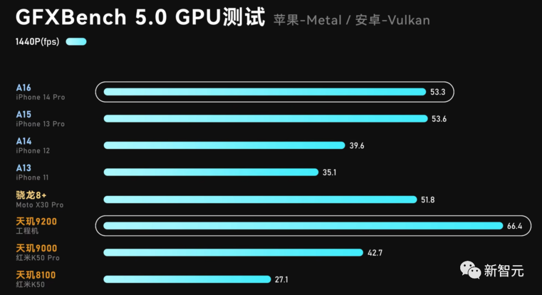 在极客湾给出的GFX Bench 5.0测试结果中,天玑9200一枝独秀,不仅将安卓一众对手甩在身后,甚至超过了苹果A16的GPU表现,而且优势明显。