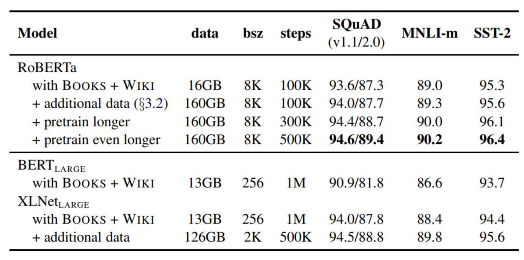 更大的模型参数量(从 RoBERTa 论文提供的训练时间来看,模型使用 1024 块 V 100 GPU 训练了 1 天的时间)