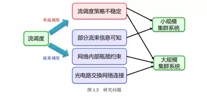 (4) 提出了光电路交换网络中的流束调度策略。针对大规模集群系统中光电路 交换技术的快速发展,本文设计了光电路交换网络中优化流束完成时间的调度策 略 GMRTF。GMRTF 同时结合了电路调度与流束调度,将同一电路上的子流适当 分组,组内不切换电路,组间采用最小剩余时间优先策略。大量仿真实验验证了 在光电路交换网络中 GMRTF 能够显著降低流束完成时间并提高吞吐量。