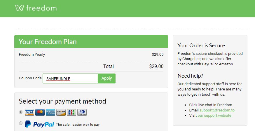 Freedom 的定价对于不少人来说较为高昂,SaneBox 为我们提供了一个 6 折的优惠码,无论是月付、年付还是买断,我们都可以在支付时使用 SANEBUNDLE 这个优惠码来获得优惠。