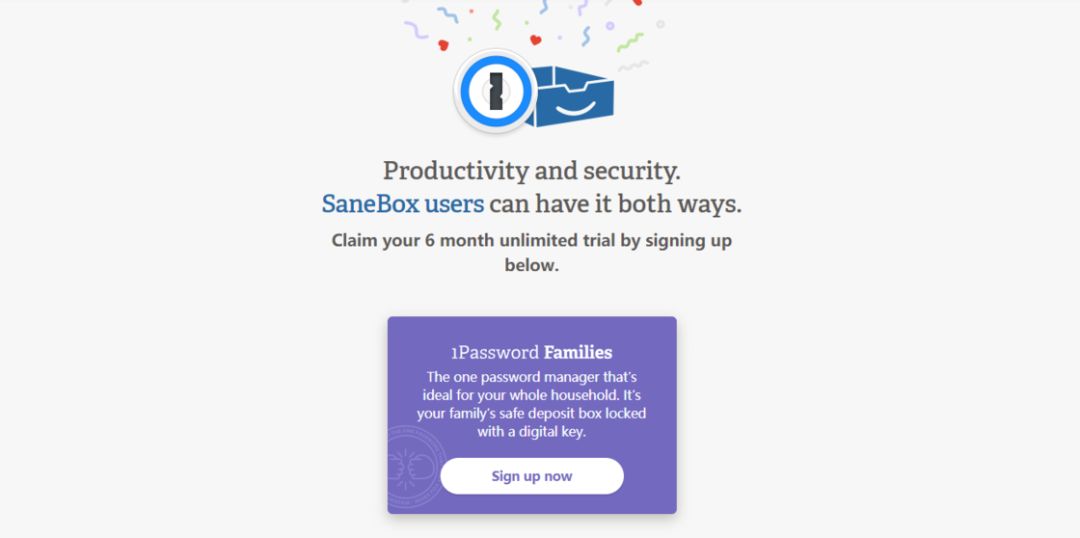 你可以注册一个新的 1Password 账户,并获得 SaneBox 赠送的 6 个月家庭版免费试用。