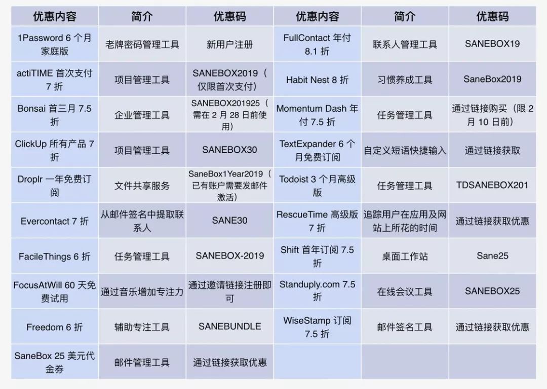 除了上述提到的六个服务外,SaneBox 还提供了辅助专注的音乐服务 FocusAtWill 的 60 天试用、SaneBox 自家邮件管理服务的 25 美金代金券等优惠,总价值超过 200 美元。所有优惠可以参考下表。