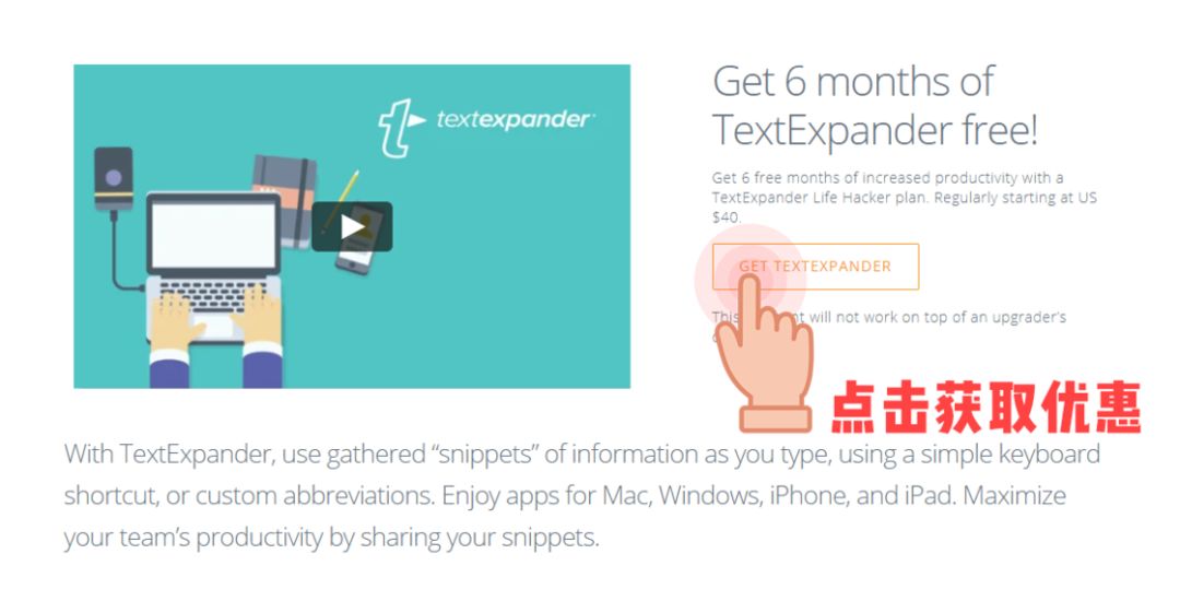 SaneBox 给我们赠送了 TextExpander 的 6 个月使用期,我们只需要在领取页面点击「Get TextExpander」并登陆账户即可获取。