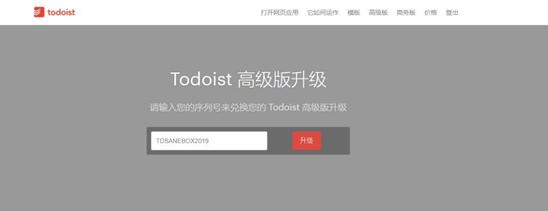 和去年一样,SaneBox 今年也为我们带来了 Todoist Premium 的三个月使用期。我们只需要登陆 Todoist 的兑换界面,输入 TDSANEBOX2019 即可兑换。
