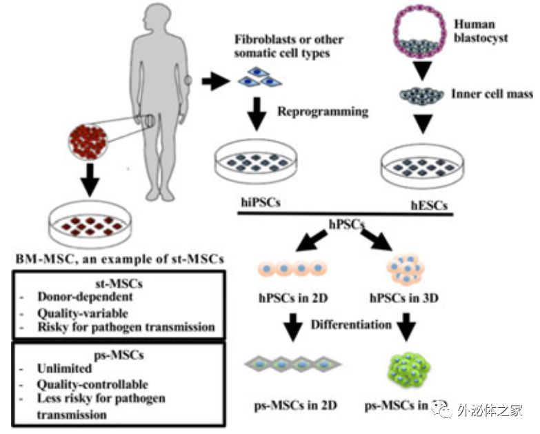人类多能干细胞(hPSCs)包括人胚胎干细胞(hESCs)和诱导多能干细胞(iPSCs),具有分化成任何类型的体细胞(包括MSC)的能力。与st-MSCs一样,hPSC衍生的MSC(ps-MSCs)包括来自hESC(hES-MSC)和人类iPSC(hiPS-MSC)的MSC,在体外和体外均具有相似的特性,如多谱系分化能力和体内免疫调节作用。ps-MSCs相对于st-MSC的独特优势包括无限供应,更便于质量控制,遗传操作和可扩展生产,更低成本和更高纯度。