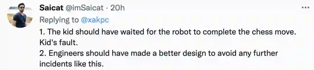 副主席还认为:「其实,小男孩的过快反应的的确是有违反安全规则的。因为,正常情况下,当人类采取行动时,应该意识到先等待机器人完成动作。」