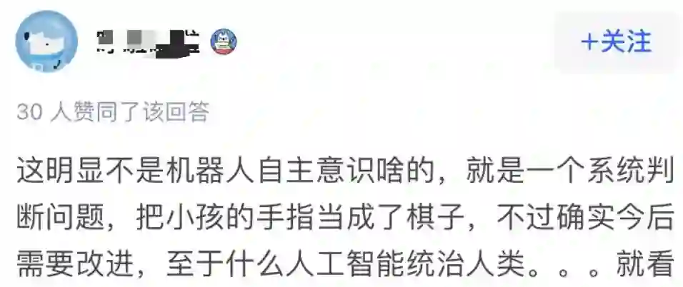 这明显不是机器人自主意识,就是一个系统判断问题,把小孩的手指当成棋子了。
