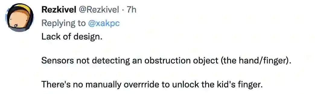缺乏设计。传感器未检测到障碍物(手/手指),而且还没有手动超控装置来解锁孩子的手指。