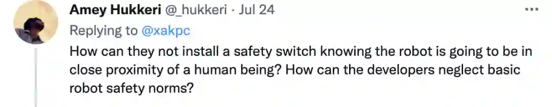 他们怎么能不安装安全开关呢,这样就知道机器人何时靠近人类。另外,开发人员怎么能忽视基本的机器人安全规范?