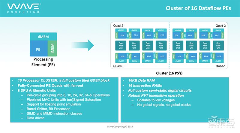 Chirs Nicol表示,Wave所做的DPU芯片,将软件接入到芯片,可以存取外部内存上的数据信息。该芯片内部集成大量Cluster,每个Cluster内包含8个DPU算术单元、16个处理元素(PE,Processing Element)及存储器。其中,PE用全局异步、局部同步设计实现,没有时钟信号,由数据流驱动。PE和CGRA可同时运行计算。