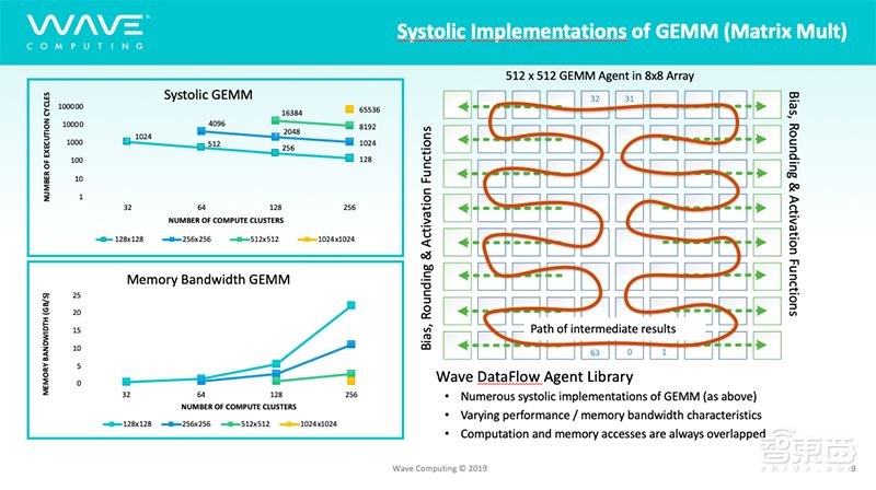 此外,Wave还引入512 x 512通用矩阵算法(GEMM)处理深度学习任务,充分利用系统的多级存储结构和程序执行的局部性,以降低能耗和加速计算。