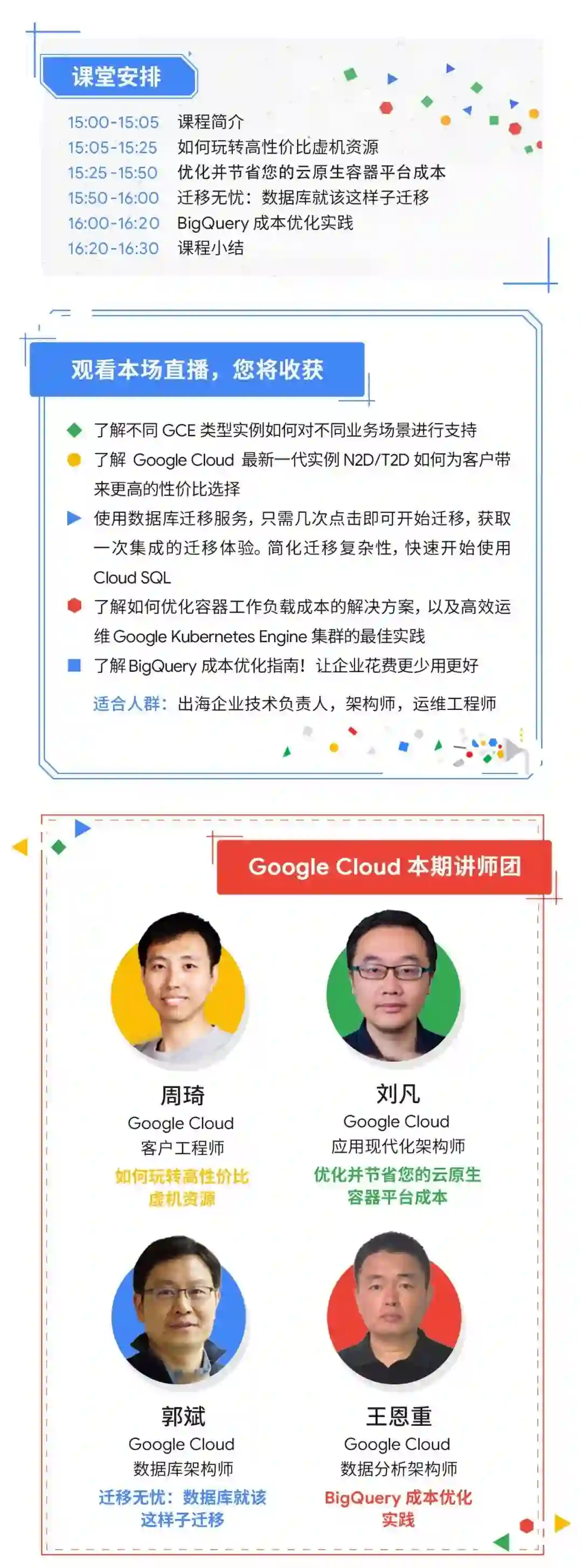 本期线上课堂,Google Cloud 架构师团队将深度分享出海企业如何利用高性价比的 GCE 虚拟机资源降低成本,使用 GKE 优化容器工作负载的成本,优化 BigQuery 使用成本,通过 DMS 实现数据库迁移无忧,在多云环境中自如迁移穿行。