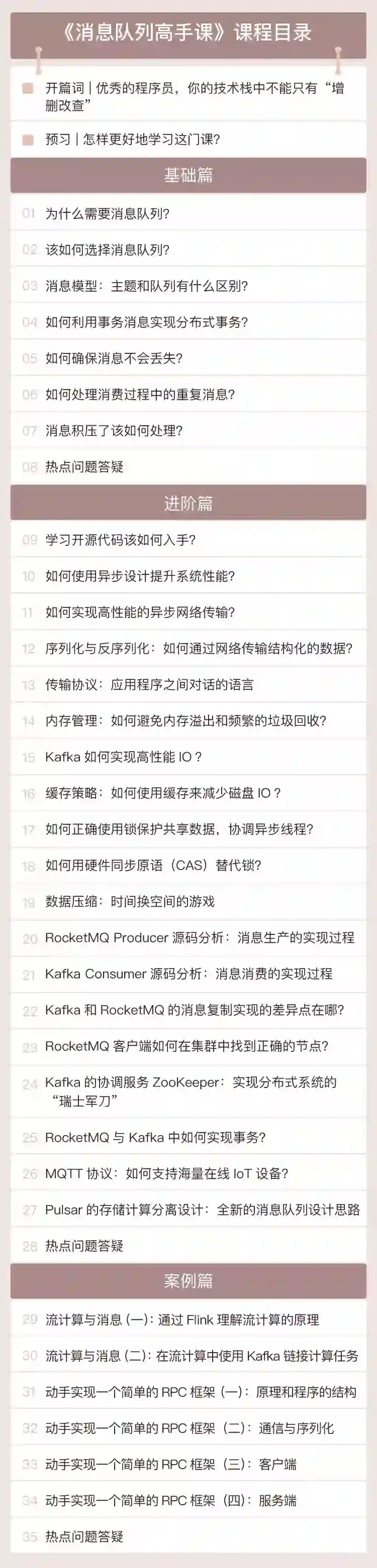 在《消息队列高手课》专栏中,我将从 基础、进阶、案例 三个部分来讲。