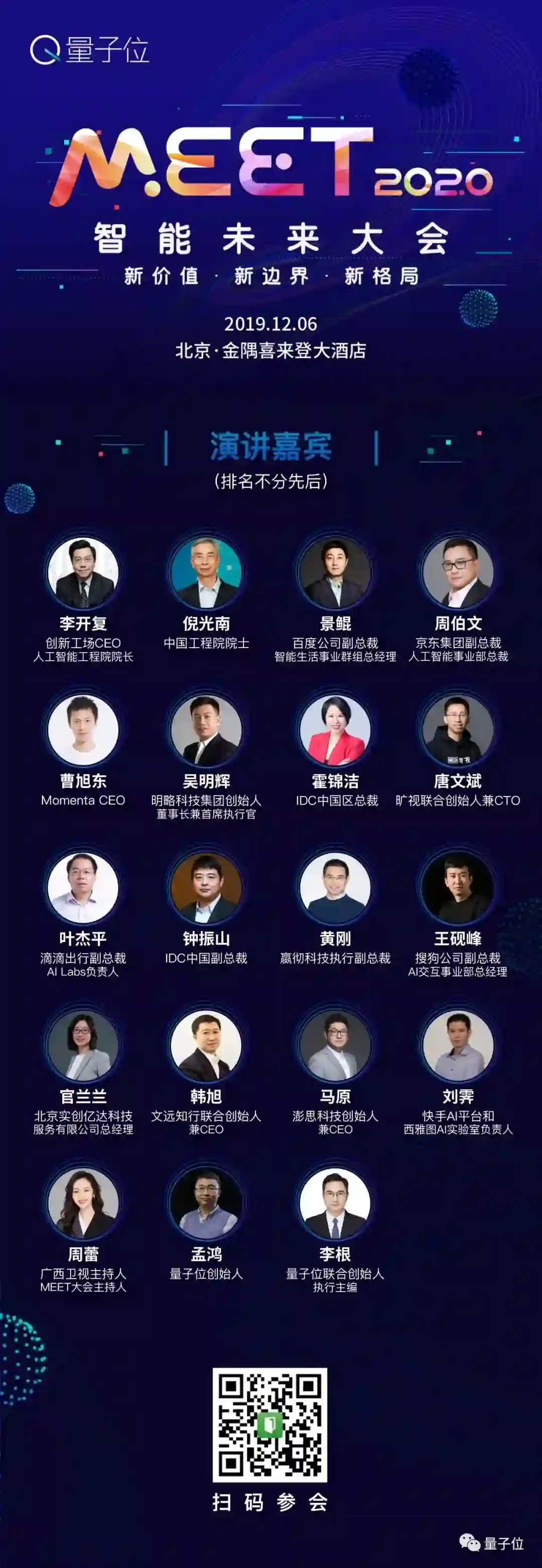 量子位 MEET 2020 智能未来大会启幕,李开复、倪光南、景鲲、周伯文、吴明辉、曹旭东、叶杰平、唐文斌、王砚峰、黄刚、马原等AI大咖与你一起读懂人工智能。观众票即将售罄,扫码报名预定席位 ~